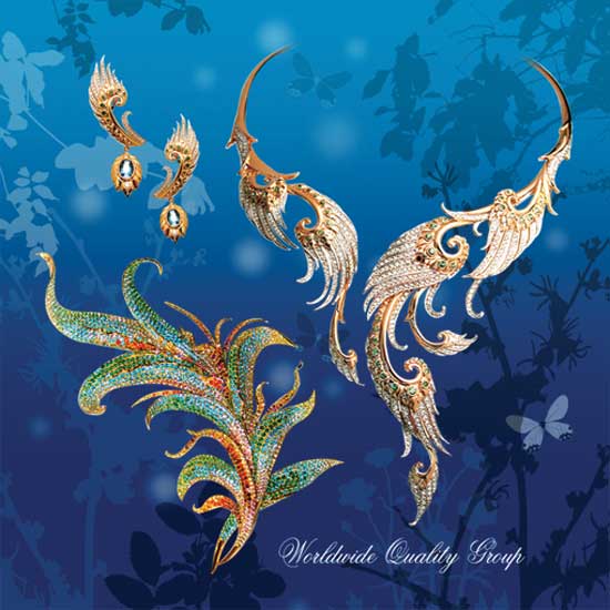 This gold earrings, brooch and necklace set is specially designed to replicate a look of peacock feather. The top is covered with colorful natural stones to add fanciness. This gold jewelry set is best to pair with glamorous evening dresses.