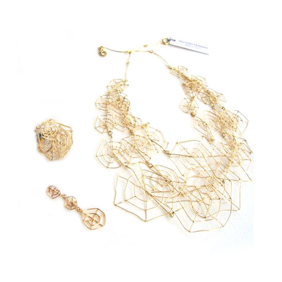 This is a gold jewelry set that comes with a ring, a necklace and a pair of earrings. Inspired by the spider web, this jewelry set is unique and stylish. This high quality gold jewelry set is great for daily wear.