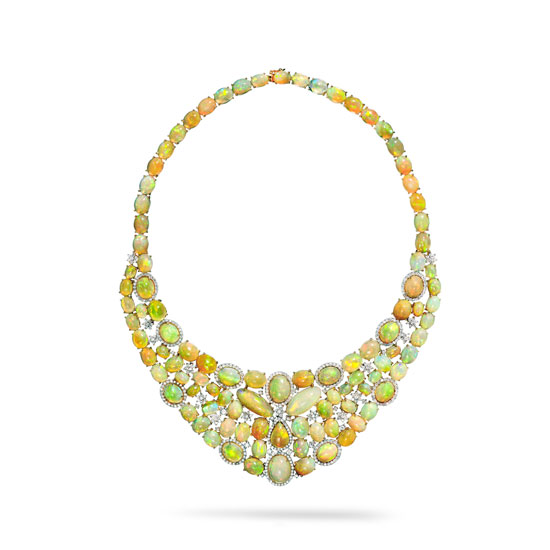 This is an 18K yellow gold necklace with a fashionable appearance. It is crafted with precious opal stones and sparkling diamonds for added elegance. This gold opal necklace is easy to mix and match with your outfits.