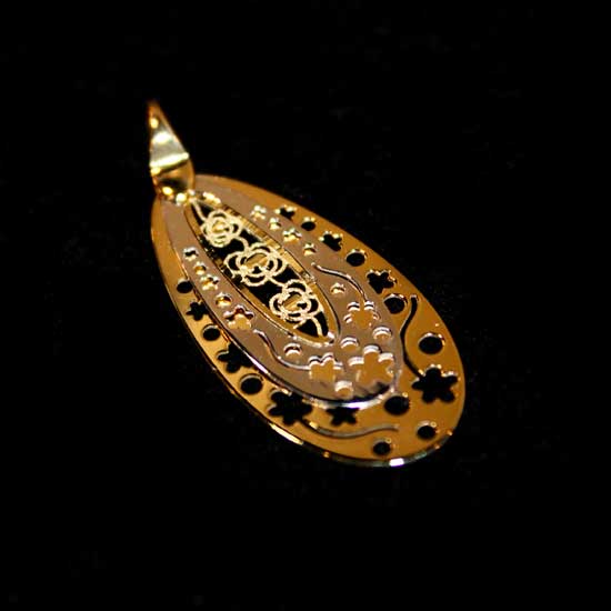 Presented here is an oval-shaped pendant with detailed craftsmanship. The oval pendant is well made of white and yellow gold materials for an opulent touch. This gold pendant is an exquisite choice for mounting on jewelry.