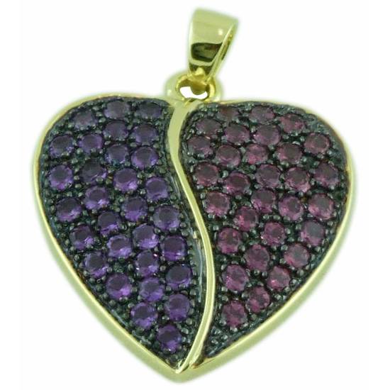 This is a 10K yellow gold pendant with amethysts and rhodolites. The heart is divided into two parts, one with 30 amethysts and another one with 30 rhodolites in cluster setting. It is suitable for everyday wear or formal occasions.