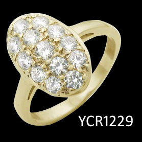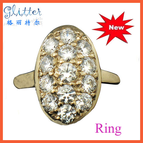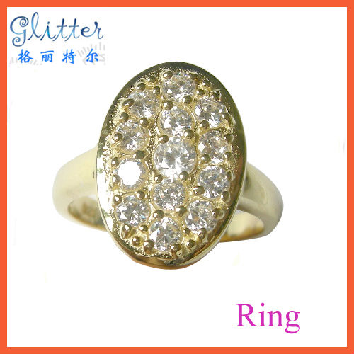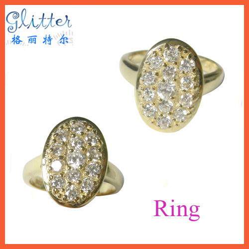The nickel and lead free 925sterling silver ring is delicately plated with 14K gold. 13 pieces of white cubic zirconia stones are beautifully set across the surface of the curved oval shaped plate. Customers can replace the white cubic zironia stones with any color of their choices.