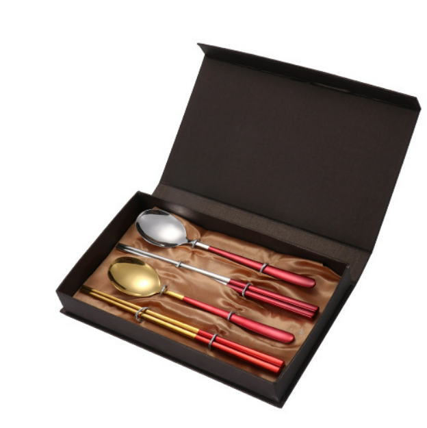 Gold and Silver Chopsticks Spoon 2 Set - METAL STAINLESS STEEL - With Giftable Box