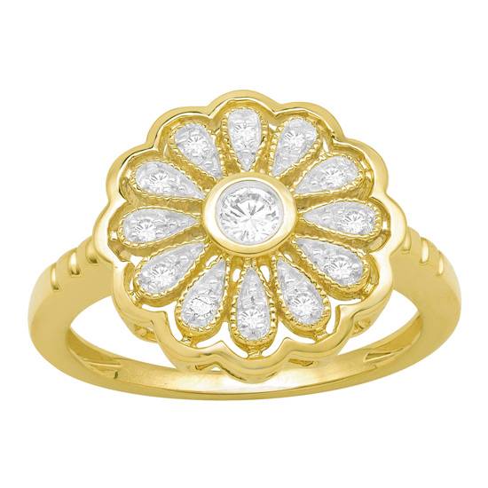 This golden ring features diamonds in its setting. A total of thirteen diamonds are found within the wavy golden rim. Twelve of them are placed neatly and orderly in pear-shaped pieces, which point towards the center, where a round and faceted diamond is situated.