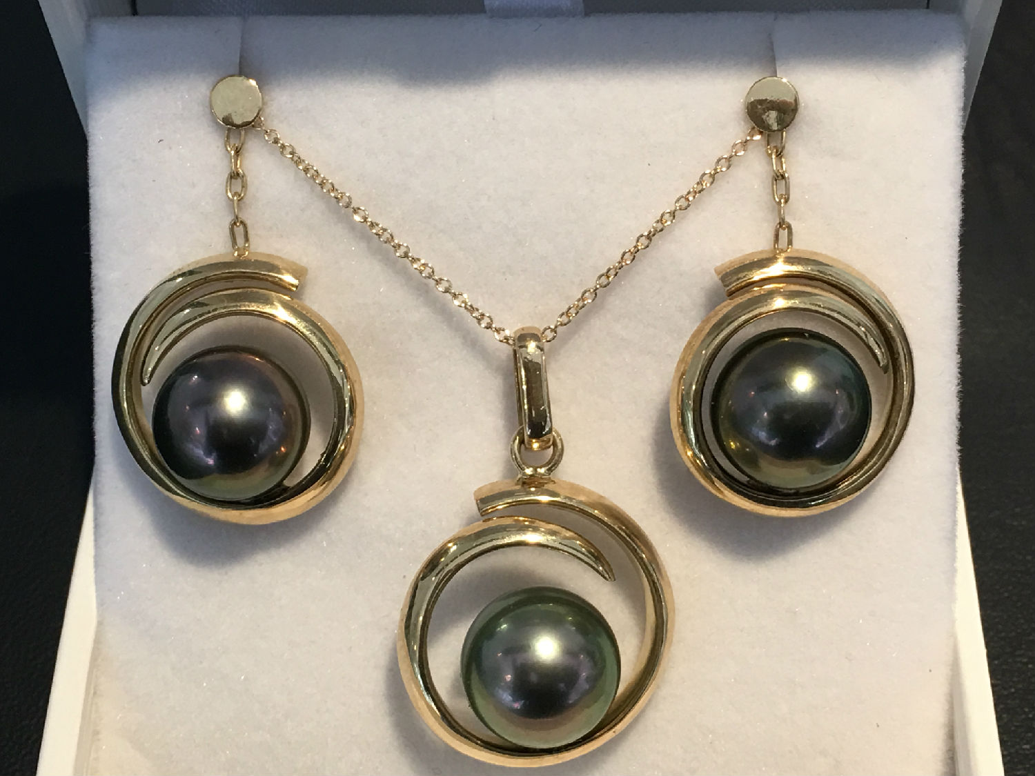 18 Karat gold shaped as a boar tusk accompanied by Tahitian Pearls.