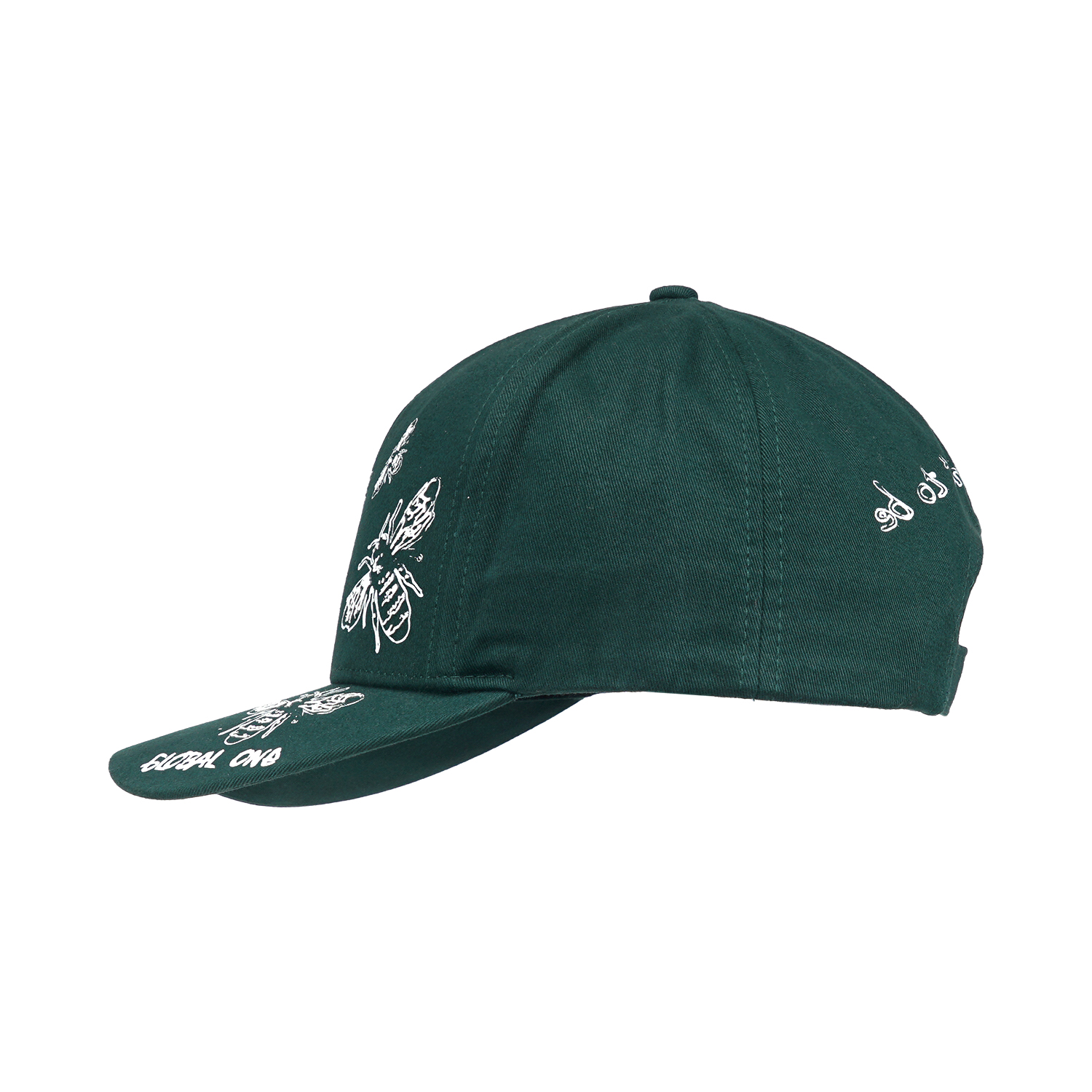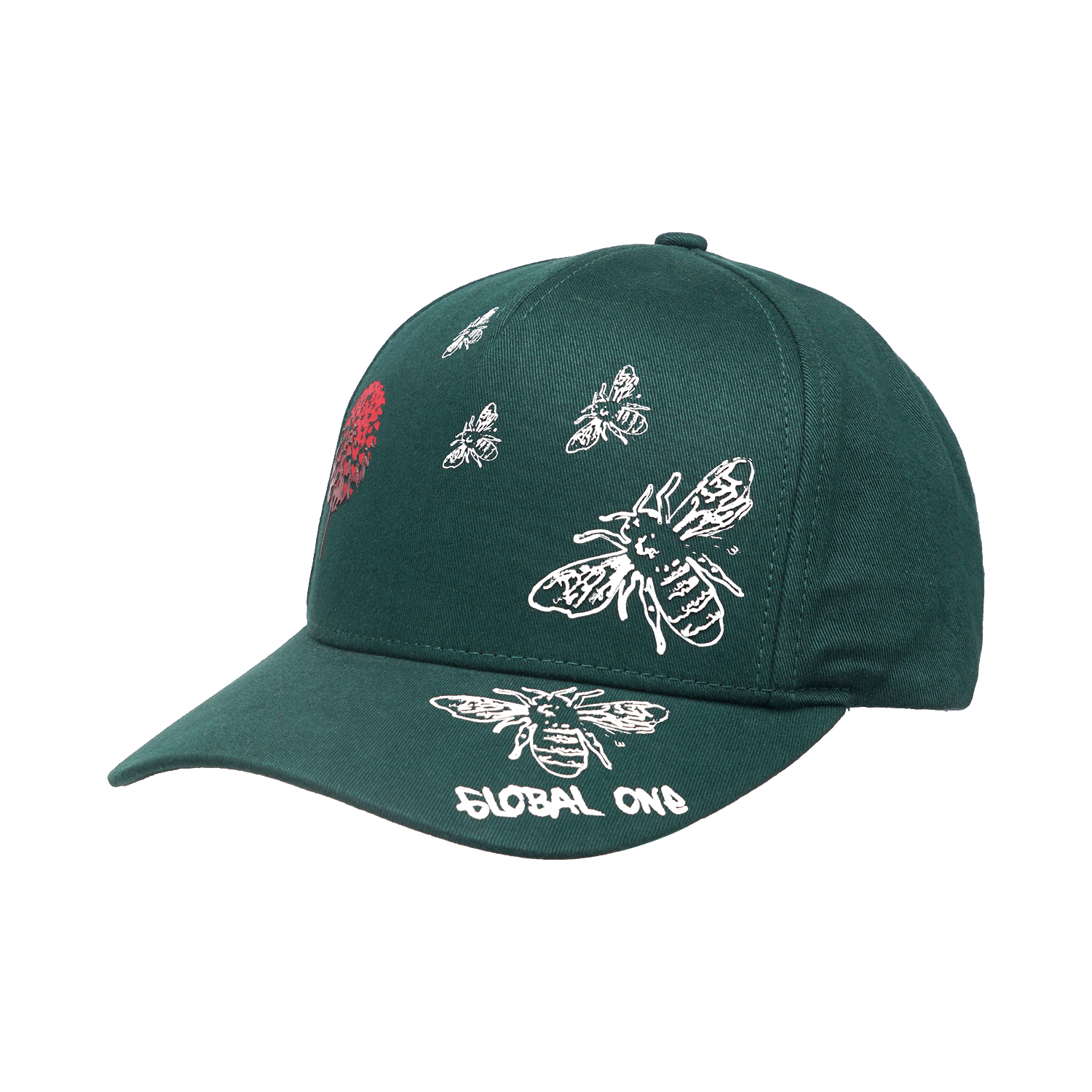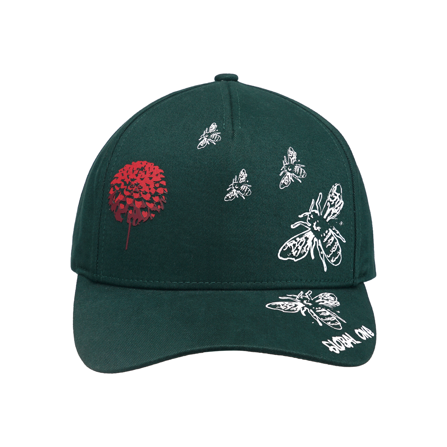 This golf cap looks great featuring a unique and intricate screen print of bees and dandelion on the front panel. The cap in a solid color is structured with five panels, a high profile, a curved brim, and a hoop-and-loop fastener. It is a versatile design to add to your product profile.