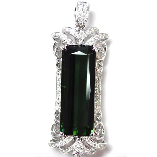 This vintage-style pendant features a dark green tourmaline as the prima donna. The elongated design is framed with 18K gold and diamonds. The pendant makes a stunning adornment for your plain neckline.