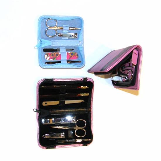 This is a grooming kit. Five basic manicure tools are packed inside. Scissors, nail clippers, nail buffers and cuticle trimmers are all included for user's convenience.