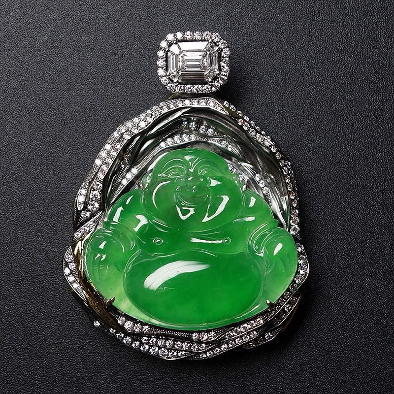 The lines studded with diamonds create a cave-like depth, with a smiling Maitreya Buddha embedded in it. The neat shape brings a modern touch to the classical Buddha statue.