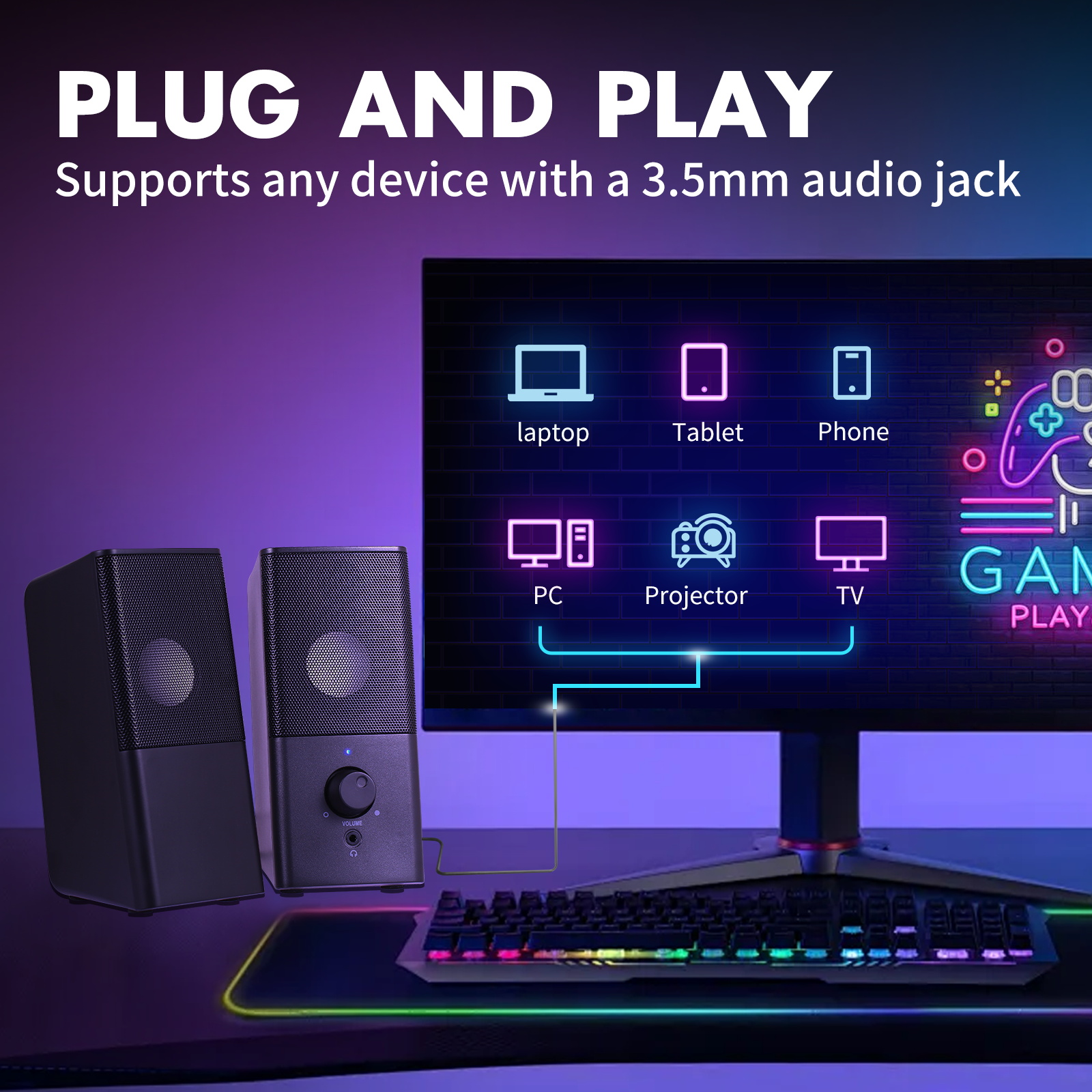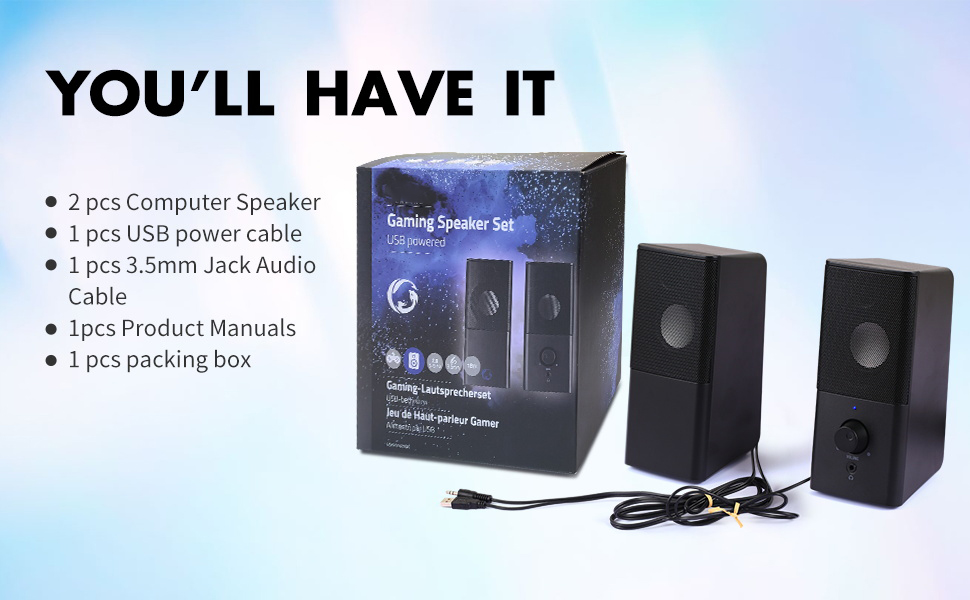 【Plug and Play Instantly】USB powered 5V speaker set for gaming monitor are designed for your portable and hand carrying. Enjoy Plug and Play instantly- just plug in the USB powered cable and the 3.5mm earphone jack for audio cable to start music world.