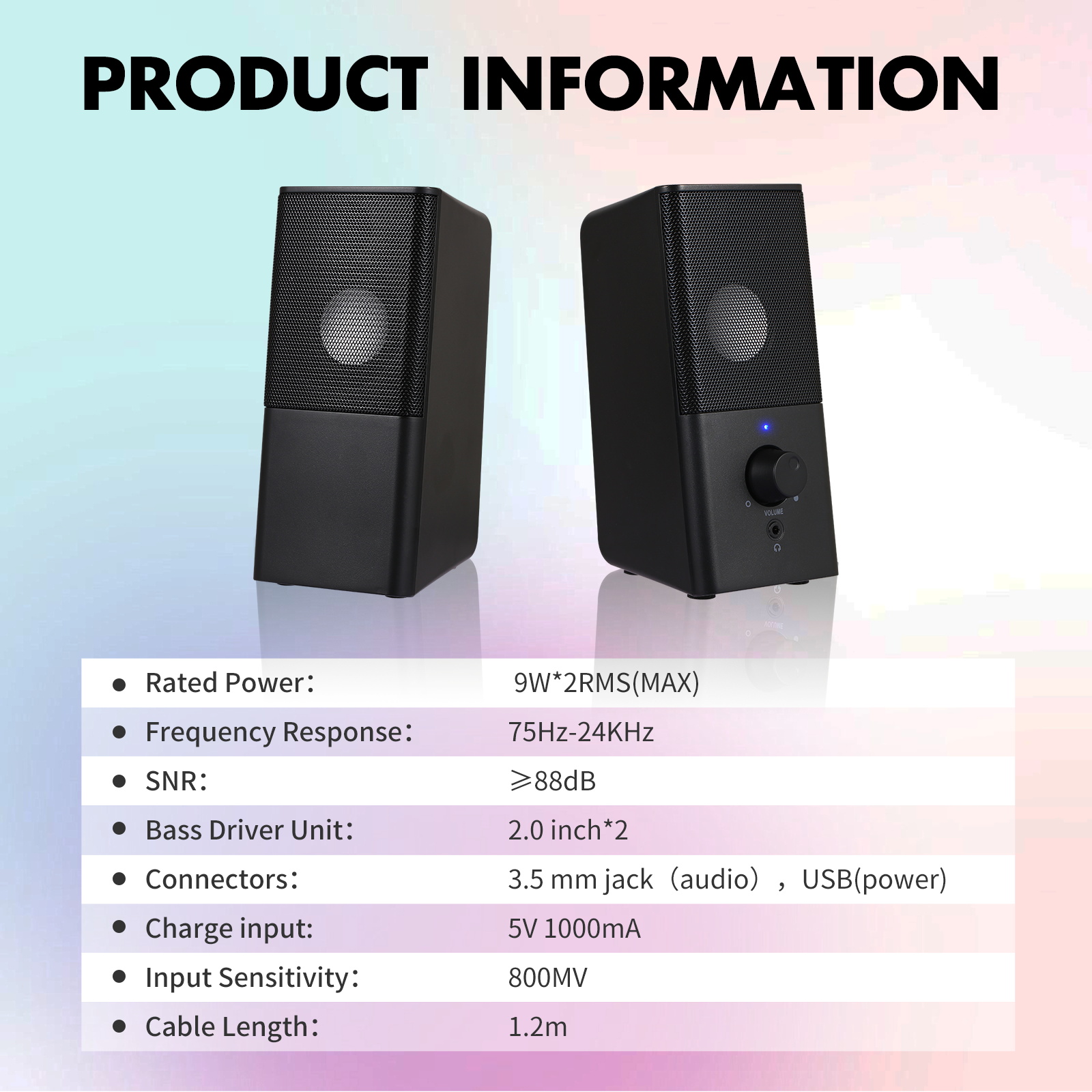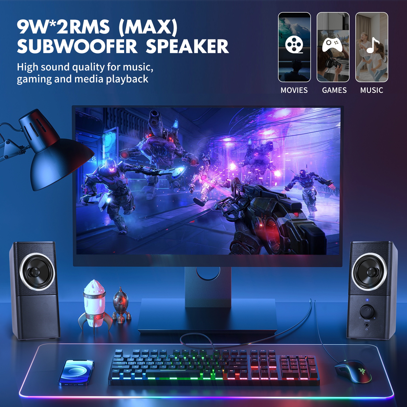 【Full-Range Stereo Sound Quality】Advanced sound drivers and a full-range 2.0 channel (9W plus 2RMS Max), this computer speakers provides the 3D stereo for your entertainment such as watching movies, gaming, and listening to music.This gaming speakers achieves excellent lows-mid-treble for an immersive audio experience.