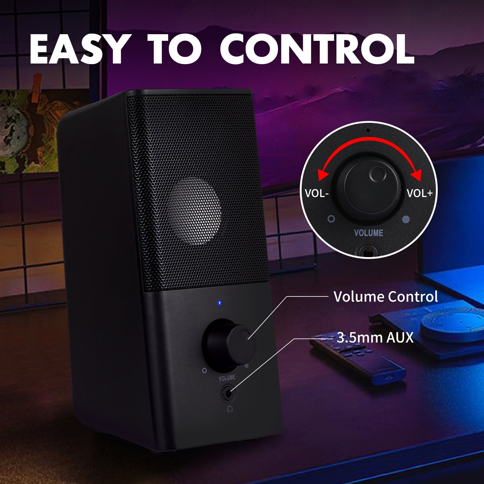 【One Knob Volume Control】Integrated volume up and volume down buttons (Min to Max) to offer you simple and accurately listening and hearing gaming and movie-watching experience. The cable between the desktop speakers is 47 inches long, and can be placed on either side of the monitor or desktop/laptop/pc/tablet.