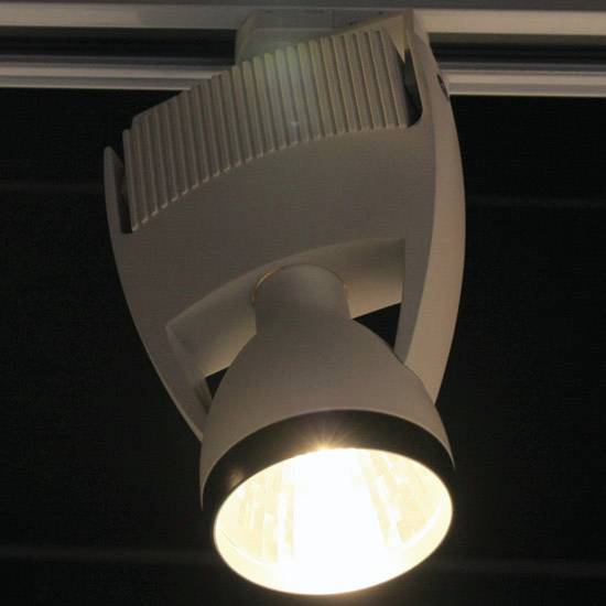 This HID track spotlight is to be assembled on rails. It can emit straight beams of light at a tilted angle. It is produced for commercial use, giving off strong and intense illumination.