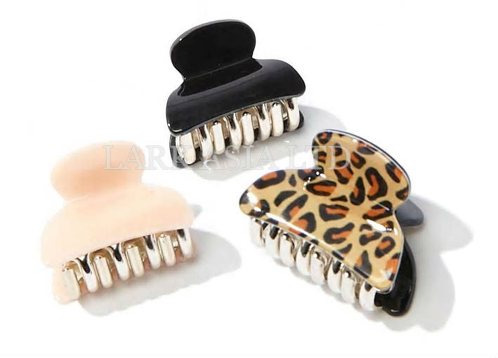 A set of hair claw clips featuring a leopard print, solid designs, and a high-polish trim.
