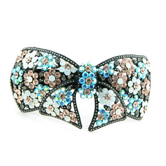 This is a hair clip for women. This hair clip has an shared outline with a ribbon. On this clip, there are flower patterns. This hair clip presents a sense of elegance.