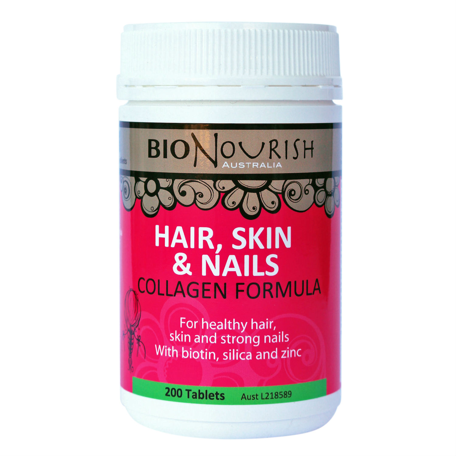 BioNourish skin hair & nails collagen formula contains essential nutrients for strong nails, healthy hair and skin.