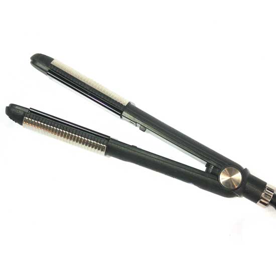 Showcased is a 2-in-1 hair straightener and curler for hair styling. The aluminum heating plate comes with an anode-processed surface for a long serving time. The stainless steel housing features a burnished touch for a stylish appearance.