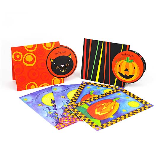 These colorful cards are decorated with typical Halloween characters, like cats, pumpkins and castles. The colors of the cards are perfectly matched to give a sense of mystery. Printed with humorous greetings, these amusing cards are suitable gifts for your friends in Halloween.