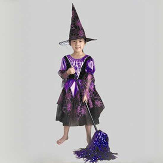 This Halloween costume set is comprised of a pointed hat, a dress and a broom. The purple appearance with shiny details adds fun to the party or carnival easily. There are different sizes available for your selection.
