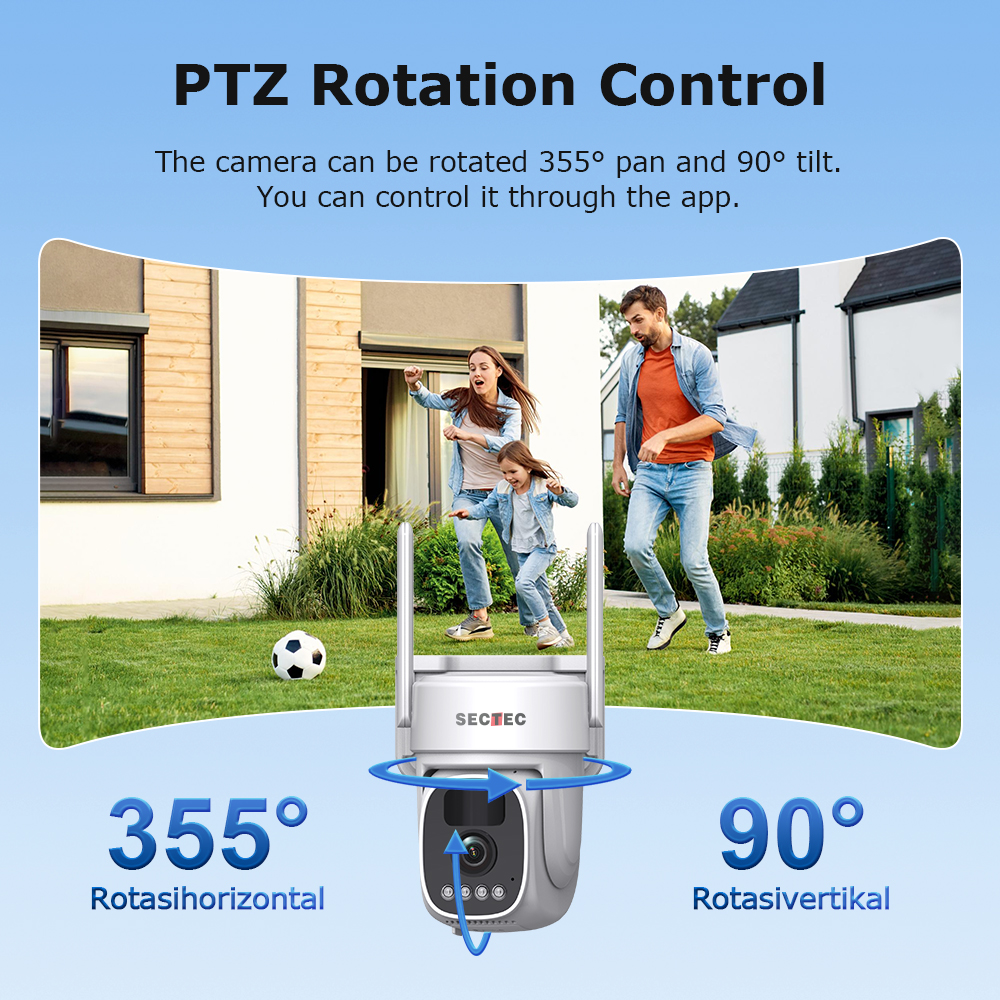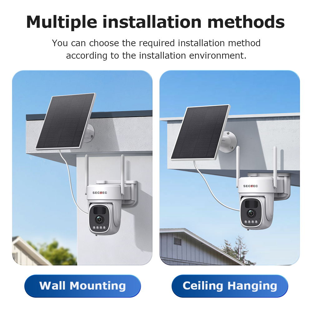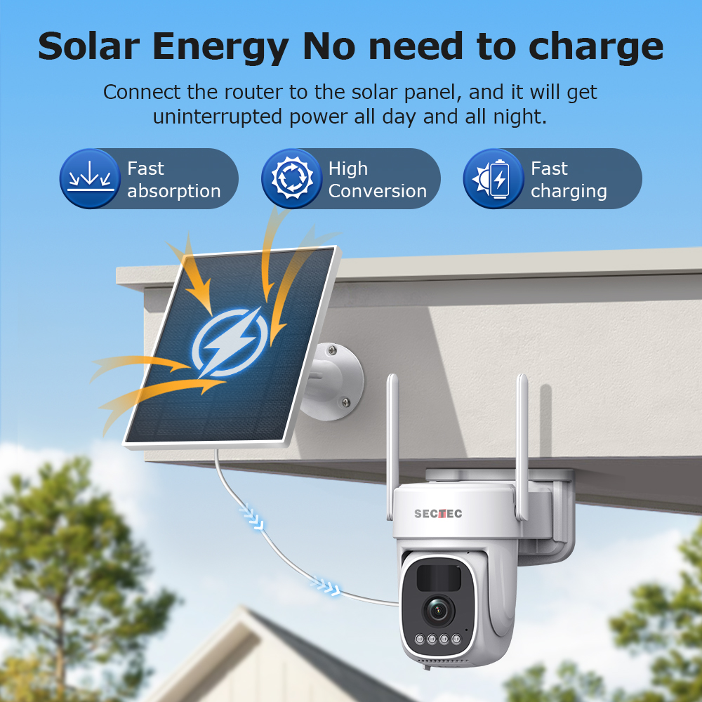 PC02 camera: Built-in 3W solar panel + 7800mAh lithium battery for continuous operation, PTZ rotation