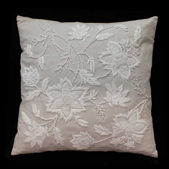 This elegant white cushion is hand embroidered with exquisite floral patterns. The cotton-filled cushion gives you ample softness and comfort. It makes a great decoration for your living room or bedroom.