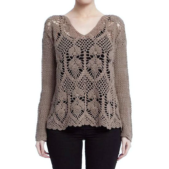 This is a hand-knitted crochet top with long sleeves and a V-neckline. It is finely made with great craftsmanship and delicate details for an attractive look. This stylish top is a great choice for fashionable ladies.