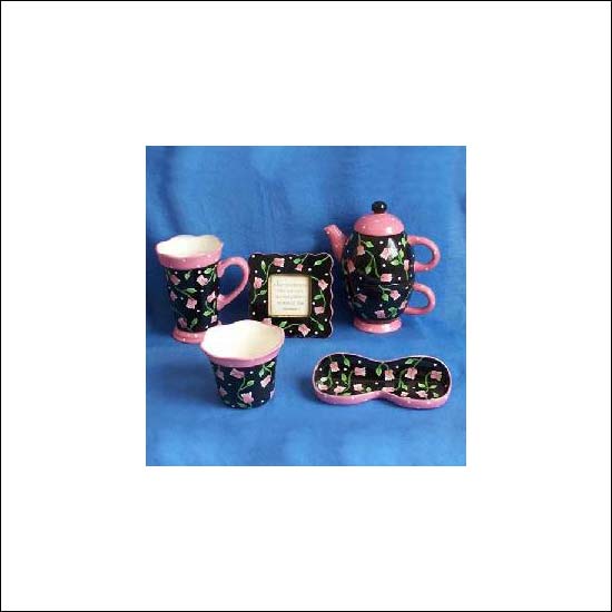 This ceramic tableware set consists of a teapot, mug, and serving plate.