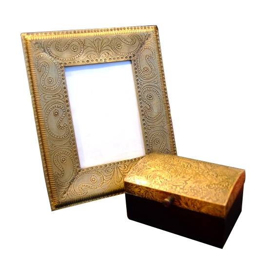 These photo frame and jewellery box feature delicate carving patterns on their metallic surfaces. Rectangular shaped photo frame can hold 5x7 inches photo. Jewellery box with metal knob is small in size.