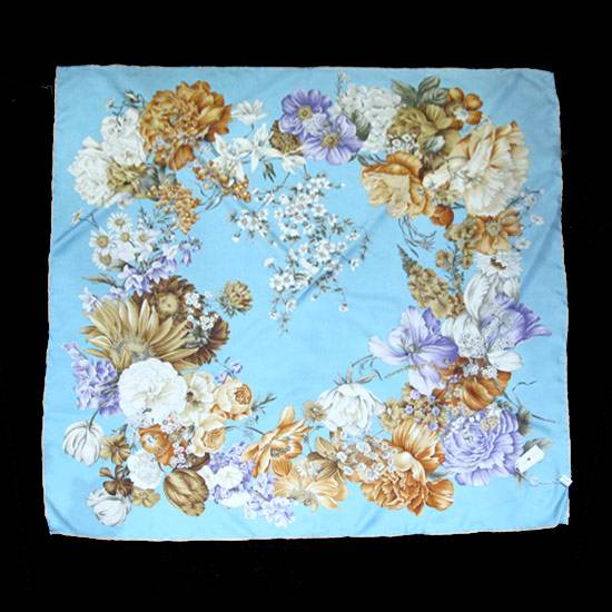 This is a square silk scarf with hand-screen-printed floral pattern. It has satin trim on edging. It has a very slender satin trim on edging. This soft and light scarf is easy to tie different style to add interest and glamor to an outfit.
