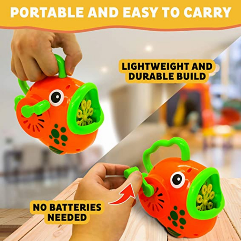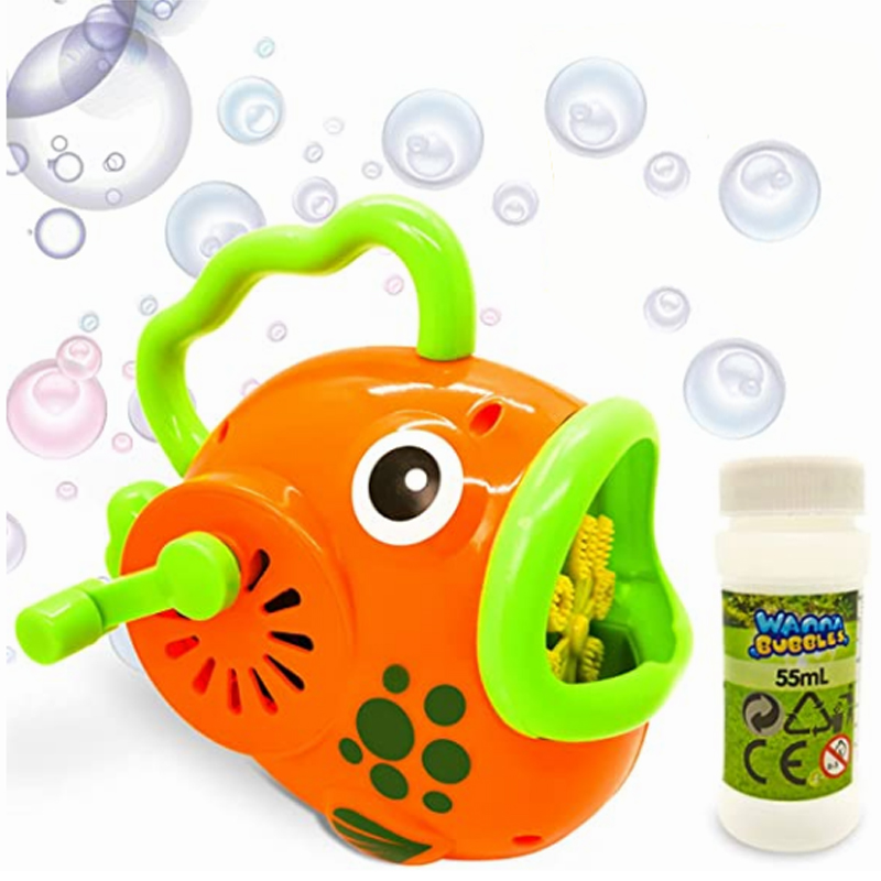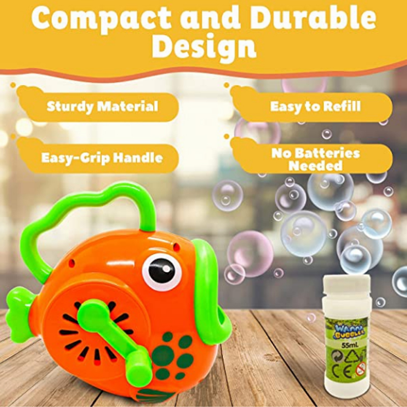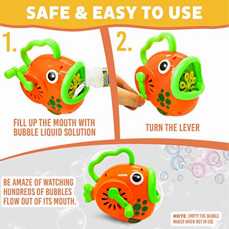 4.Safe and easy to use: each package comes with a safe bottle of used bubble liquid for a bubble machine.So your chaind has everything he needs. Simply pouring the bubble solution into the fish mouth, shake the lever,and watch the hundreds of bubble rain around the children.
