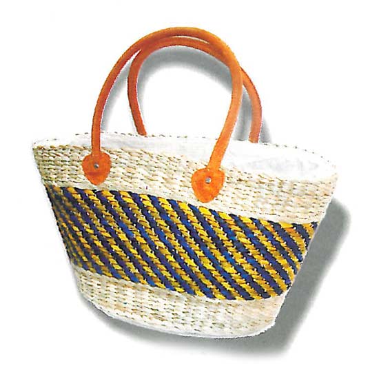 With the featured handbag, you can look fashionable this summer. The bag comes with oblique stripe patterns of blue and yellow. It is matched with orange-color handles which are long for easy carrying.