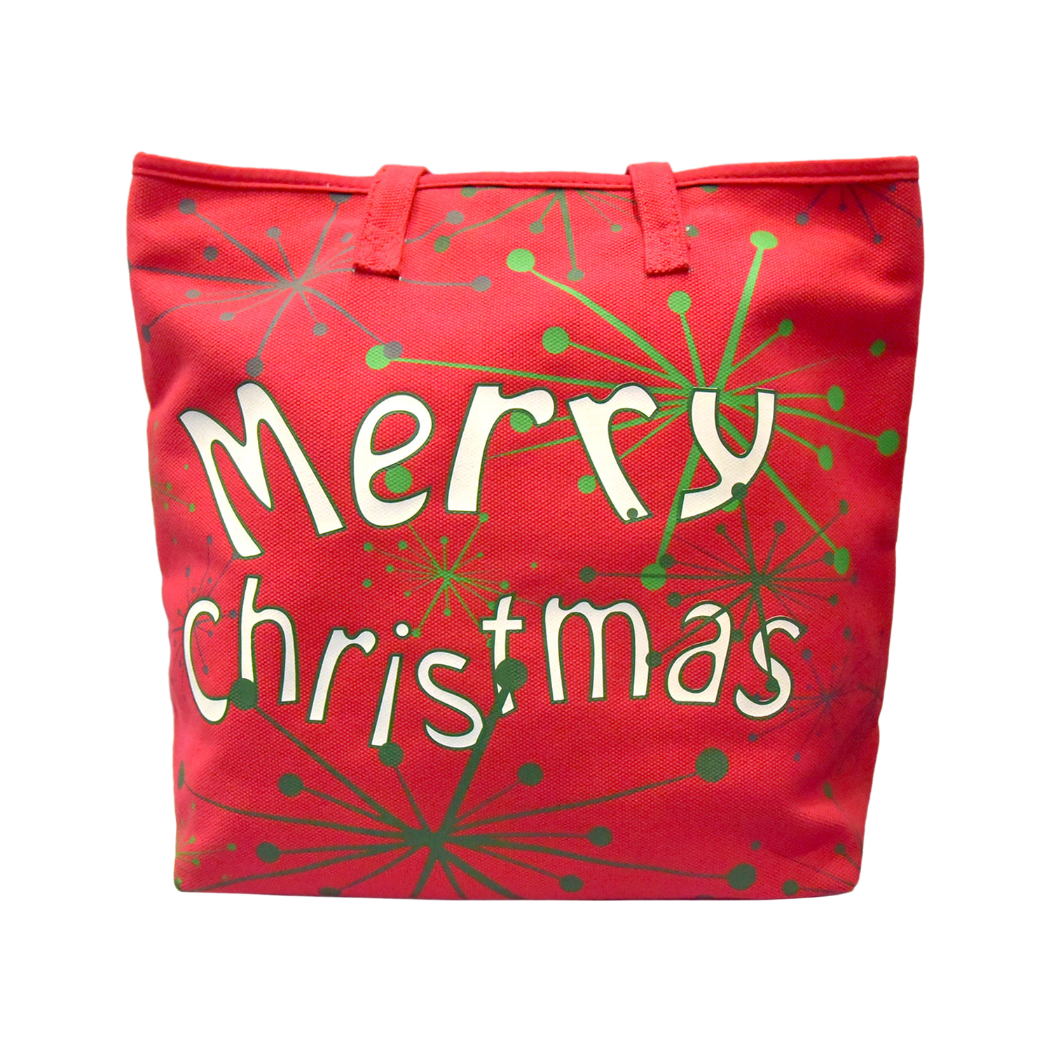 Featured here is a canvas handbag with a festive themed design. It is rectangular shaped and is embellished with “Merry Christmas” on the exterior. This handbag comes with magnetic buttoned closure and has a pair of handles on top for comfortable carrying.