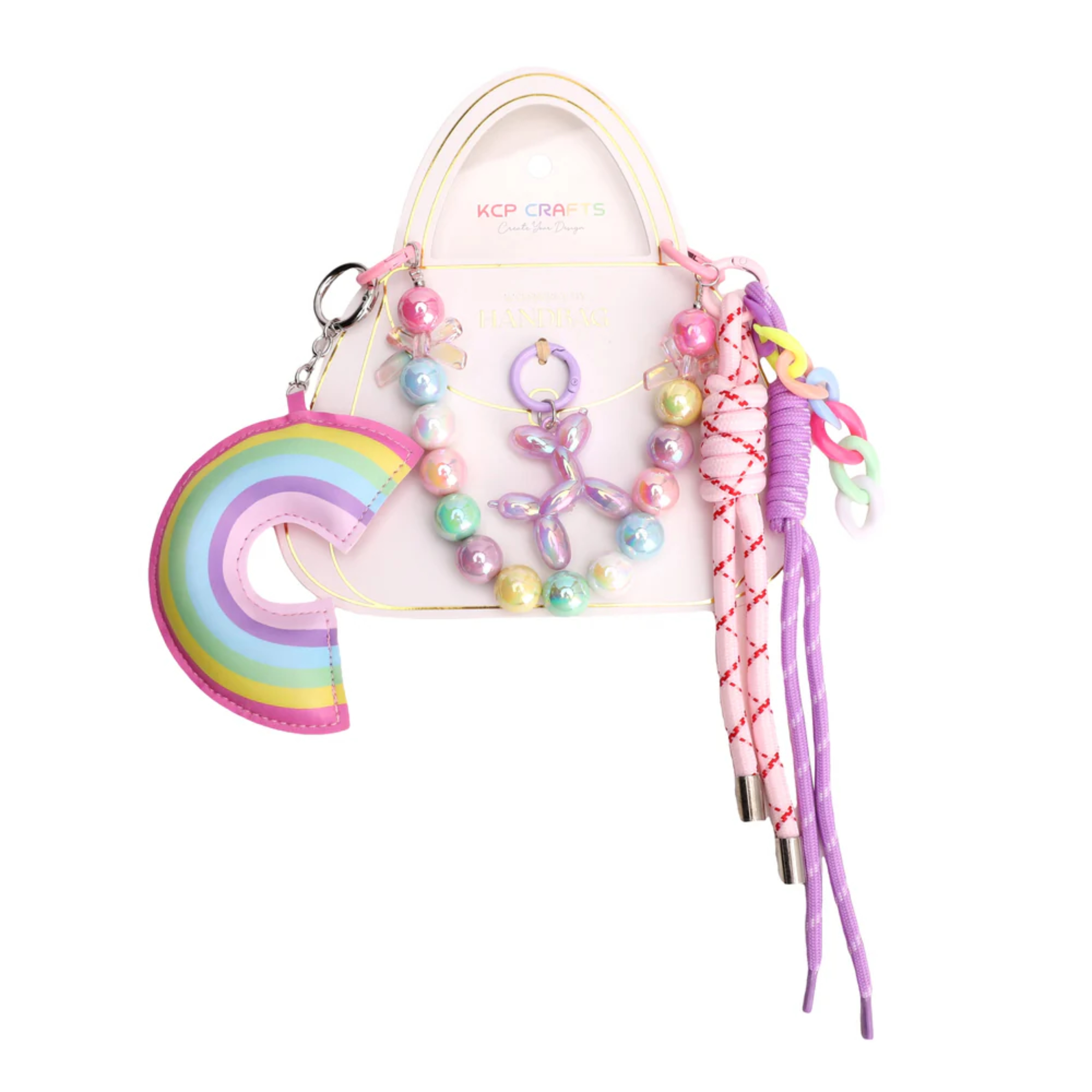 This handbag accessories kit adds a vibrant, whimsical touch to bags with colorful rainbow and pastel elements.