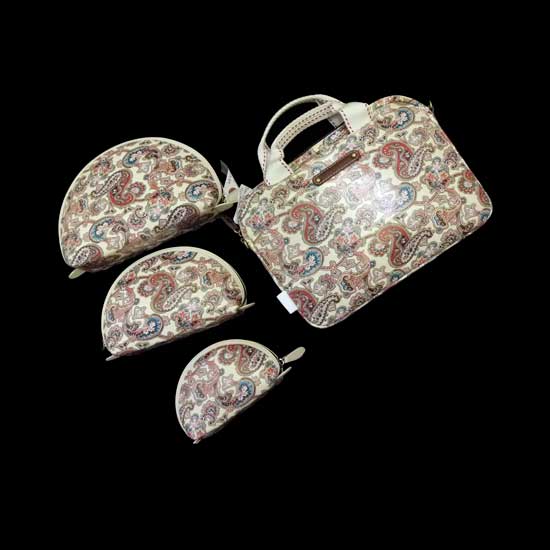 This is a 4-piece handbag set highlighted with exotic patterns. It is comprised of three pouches and a compact tote bag. This fashionable handbag set is a great choice for modern ladies.