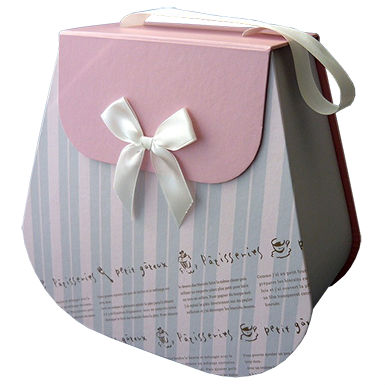 This handbag shaped gift box features a white tied ribbon on the front. Along with a white ribbon handle and a pink lid, the main part in pale pink and blue stripes create a sweet and girly style. It complements young ladies with an adorable look. Pack your products with this exquisite gift box.