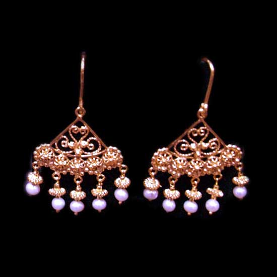 The handcrafted earrings flaunt sterling silver casting with gold plating. The drop design comes with freshwater pearls for a touch of elegance. The intricate design makes them stand above the rest.