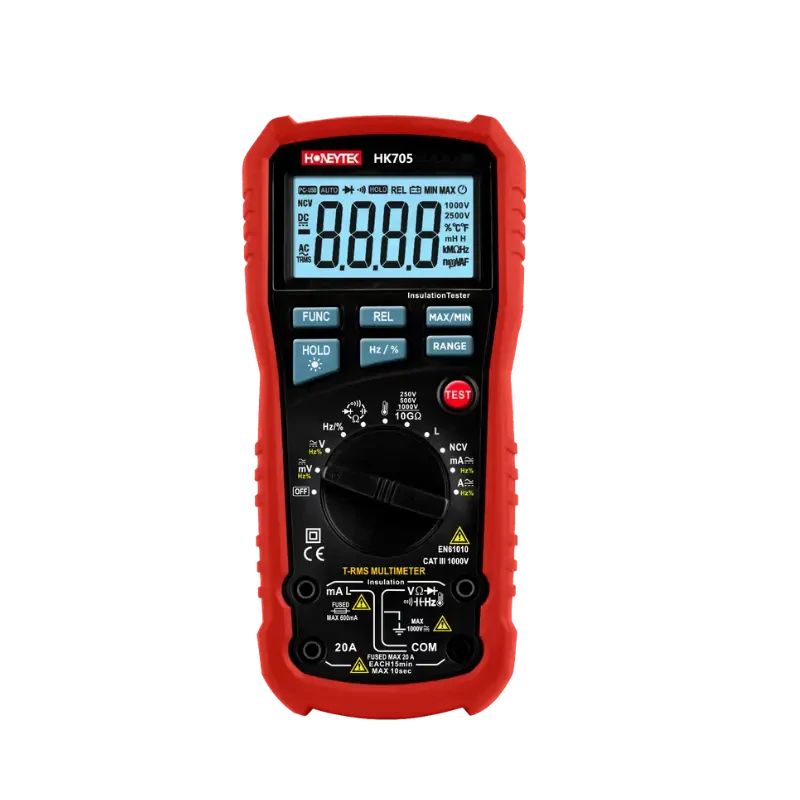 The HK705 goes beyond standard insulation testing by integrating essential multimeter functions into one portable instrument. In addition to insulation resistance measurement up to 10.0GΩ, it supports AC/DC voltage, AC/DC current, resistance, capacitance, frequency, duty cycle, temperature, and inductance measurement. Features such as diode test, continuity buzzer, data hold, relative mode, LCD backlight, and auto/manual range selection improve convenience for both workshop and on-site applications.