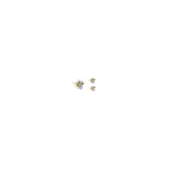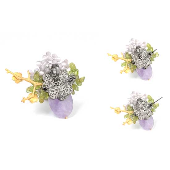 This photographed brooch exudes a very feminine style with the pale violet use. Capturing attention is the oval violet gemstone. Sitting on top of the stone are smaller beads of grape purple and green. Branching floral adornments further suggest a romantic vibe.