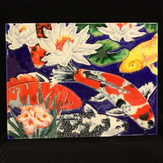 This stunning ceramic decoration features an image of a pond with white lotus and five fish. The superior handmade details help create a charming look. Decorate your home with this splendid wall ceramic decoration.