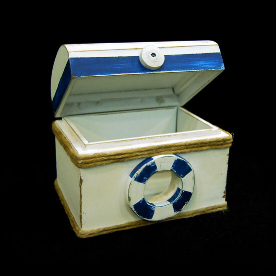 This adorable marine style handmade chest is great for storing jewelry or other items. The cord detail and life buoy ornament delight this simplistic chest. The rough finish gives it a worn-out look that stands out from others.