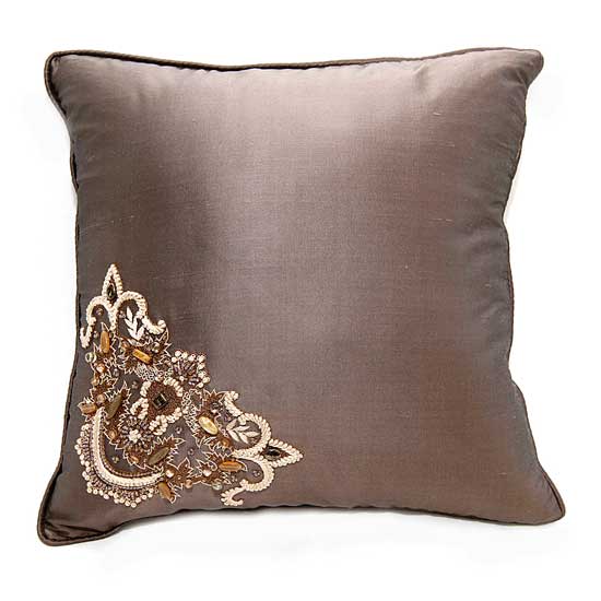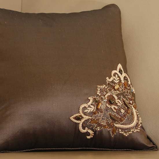 This exquisite cushion cover is hand embroidered and beaded with delicate filigree patterns on one corner. Crafted of 100% silk, the cushion cover showcases a smooth and lustrous texture. Add a touch of refinement to your home decor with this beautiful cushion cover.
