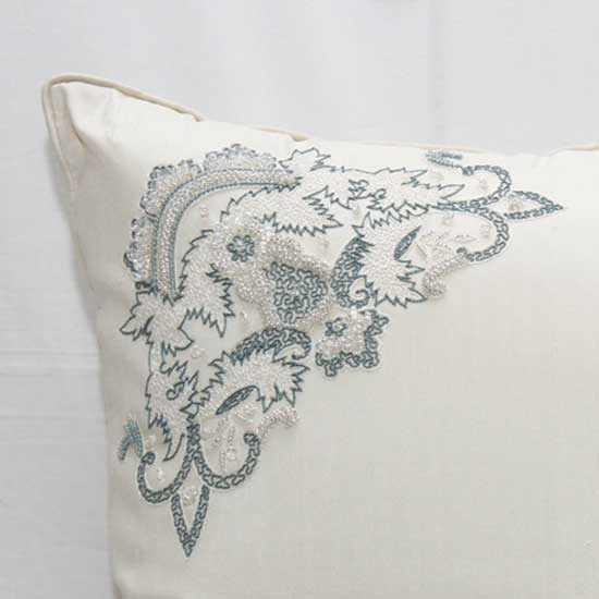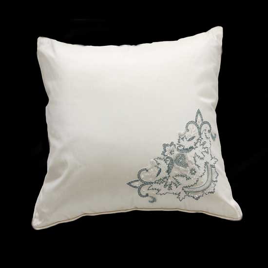 This white cushion is hand embroidered and beaded with delicate filigree patterns on one corner. The sumptuous 100% silk fabric offers added luxury. Update your bedroom or living room decor with this exquisite silk cushion cover.