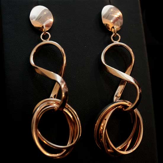 Displayed is a pair of handmade earrings plated with rose gold. The earrings feature 8-shaped ornaments which sling a handful of rings. These accessories appeal to you with their alluring tone as well as luster.