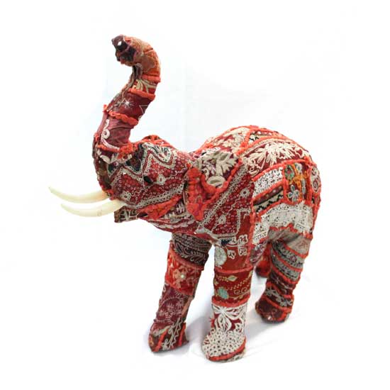 This is a handmade elephant with a vivid and realistic roaring posture. It is meticulously crafted with sari fabric in assorted bright and festival colors. This refined craft is a wonderful decoration for your home.