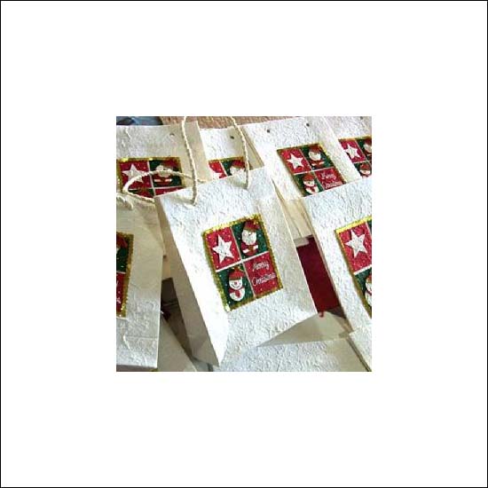 White color paper bag with a square of Christmas patterns surrounded by gold color sequins.