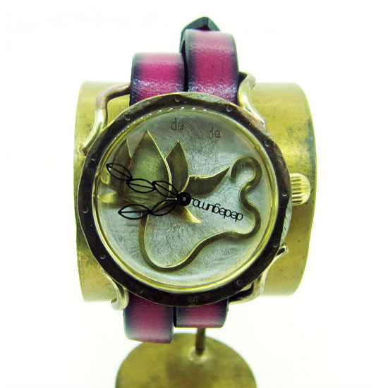 This stylish handmade ladies' watch features a charming golden lotus on the dial. The stalk curves into a '3' as a time marker. The leaf-shaped hands add extra style and delight to the overall design.