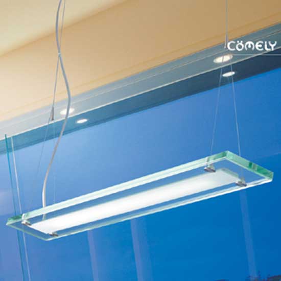 The rectangular lamp is hung from the ceiling by wires. The clear tempered glass shade allows optimal light diffusion. Illuminate the living room with this simple glass hanging lamp.