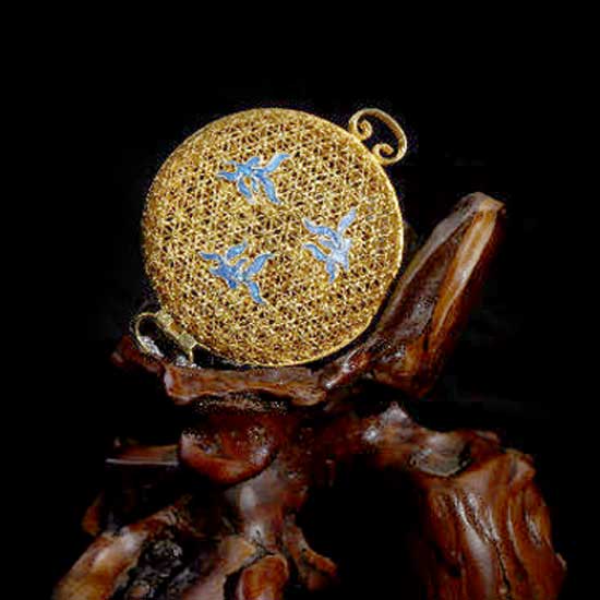 Displayed is a hanging sachet that comes in a round and flat shape. Using the famous intricate inlaid filigree technique, this decorative sachet has a sophisticated appearance. This beautiful hanging sachet is a unique ornament.