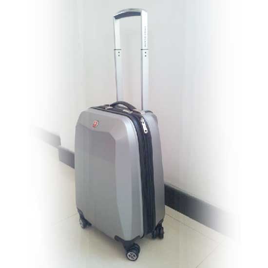 Here is a compact suitcase in gray. It boasts a hard shell to ensure years of performance. The reliable retractable handle allows effortless pulling.