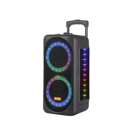 speaker size: 8"*2 Bluetooth version: V5.0 output power:5W*2 battery :3.7V/3600mAh Supported:BT/ USB /TF/ FM /AUX/RGB LED/TWS Product size:315*290*605MM